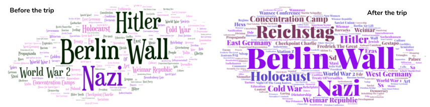 For instance, pupils were asked to write down any technical expressions, terms or questions that they associate with the history of Germany and Berlin. On average, they each produced 6 tokens (words, phrases or questions). The same exercise was done after the trip and both sets of results have been displayed in word clouds to show the difference in the responses.
