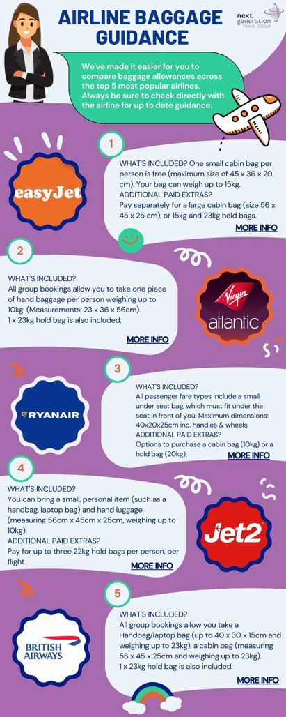 Familiarise yourself and your group with the baggage allowance provided by your airline, including cabin baggage dimensions, weight limits, and the number of checked bags allowed. This information is usually available on the airline's website.